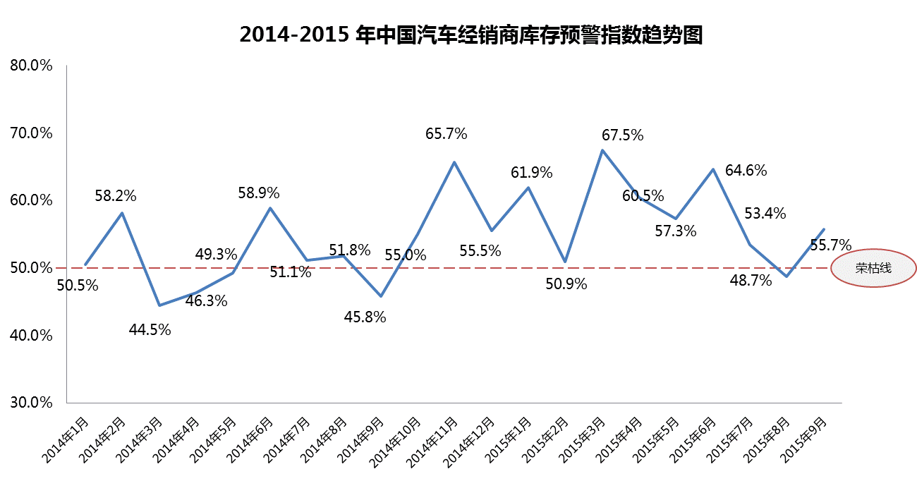中国汽车流通协会发布的“中国汽车经销商库存预警指数调查”VIA(Vehicle Inventory Alert Index)显示,2015年9月库存预警指数为55.7%,比上月上升了7.0个百分点。库存预警指数处于警戒线以上。