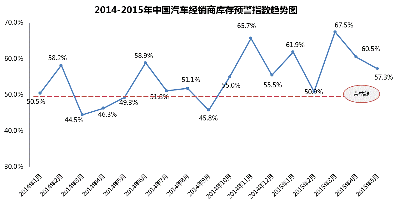 中国汽车流通协会发布的“中国汽车经销商库存预警指数调查”VIA(Vehicle Inventory Alert Index)显示,2015年5月库存预警指数为57.3%,比上月下降了3.2个百分点。但仍处于警戒线水平以上。