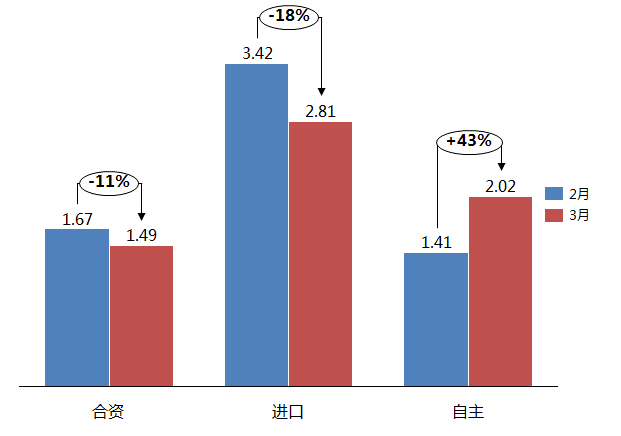 3月份,合资、进口品牌库存系数均有不同程度的下降,自主品牌的库存系数上升。合资品牌库存系数由上月1.67降至1.49,环比下降11%,接近预警线;进口品牌库存系数由上月的3.42降至2.81,环比下降18%,进口品牌库存水平有所下降;自主品牌库存系数由上月的1.41升至2.02,环比上升43%,1-2月份自主品牌经销商的销售量大于进货量,经销商库存压力不大。3月份厂家补充库存,库存量有所增加,库存压力有所上升。