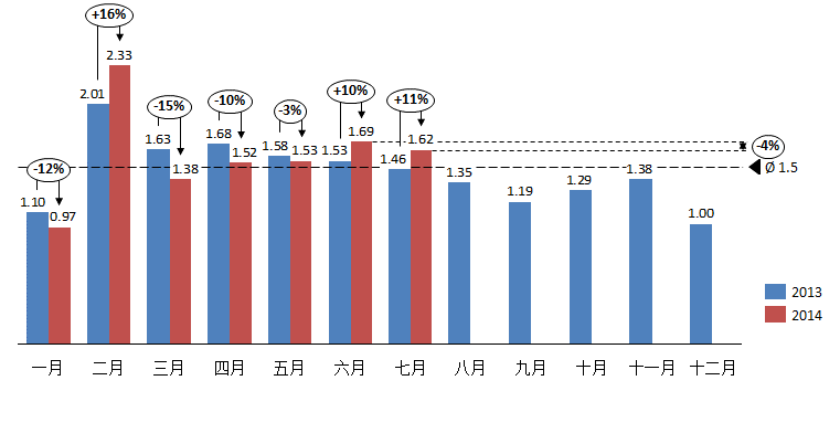 2014年7月份库存系数为1.62 环比略降
