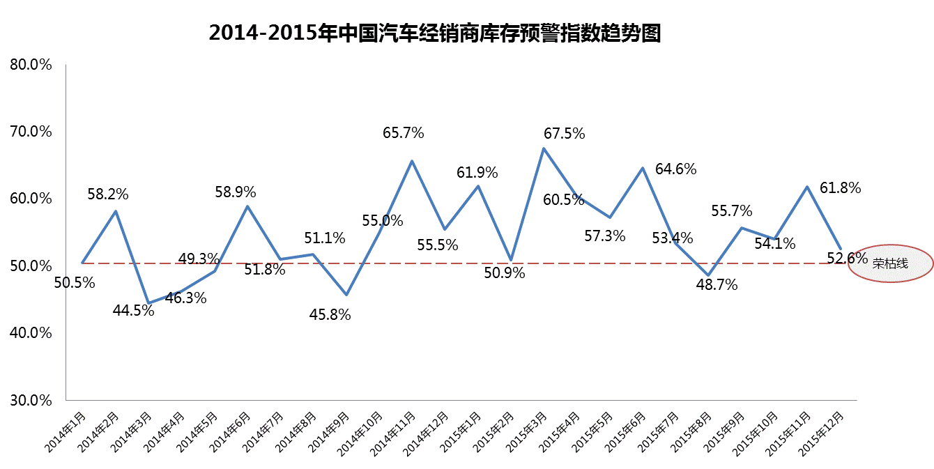 中国汽车流通协会发布的“中国汽车经销商库存预警指数调查”VIA(Vehicle Inventory Alert Index)显示,2015年12月库存预警指数为52.6%,比上月下降了9.2个百分点??獯嬖ぞ甘τ诰湎咭陨稀?