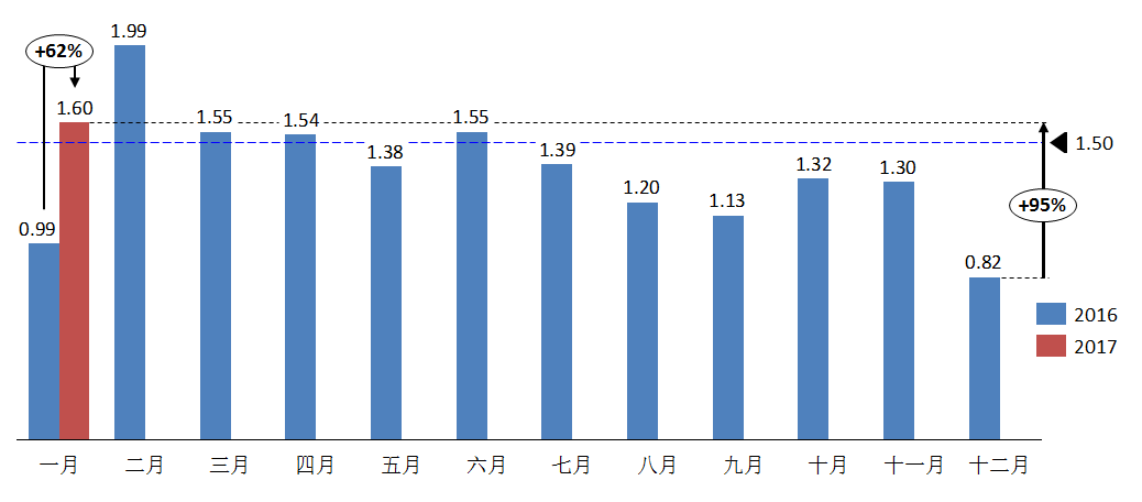 2017年2月18日,中国汽车流通协会对外发布2017年1月份“汽车经销商库存调查结果”。1月份汽车经销商综合库存系数为1.60,环比上升95%, 同比上升62%,经销商库存水平位于警戒线以上(见图1)。