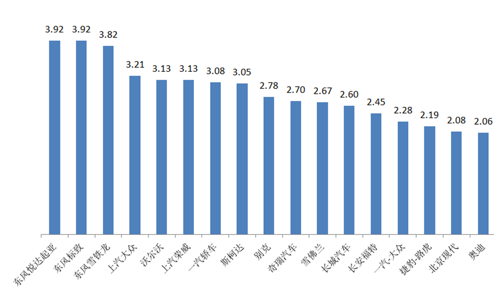 2月,17个品牌库存深度在两个月以上,分别是:东风悦达起亚、东风标致、东风雪铁龙、上汽大众、沃尔沃、上汽荣威、一汽轿车、斯柯达、别克、奇瑞汽车、雪佛兰、长城汽车、长安福特、一汽-大众、捷豹路虎、北京现代、奥迪。
