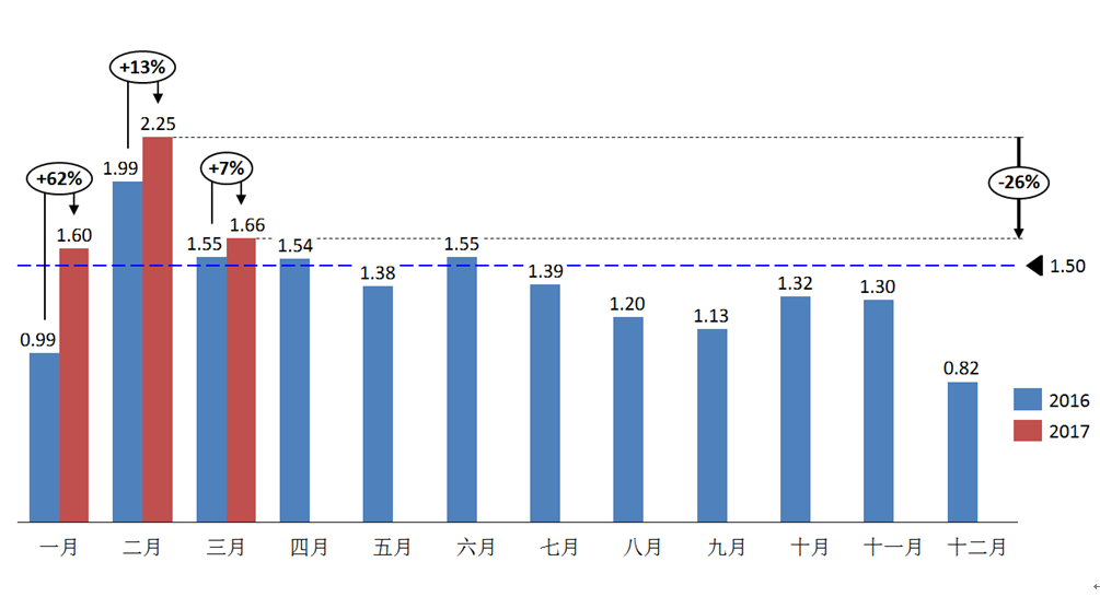 2017年3月汽车经销商库存系数为1.66