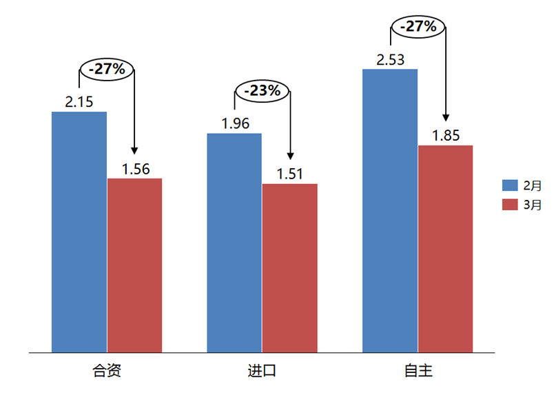 3月份,合资品牌、进口品牌和自主品牌的库存系数相比上月均有所下降。合资品牌库存系数为1.56,环比下降27%;进口品牌库存系数为1.51,环比下降23%;自主品牌库存系数为1.85,环比下降27%。3月,合资品牌、进口品牌和自主品牌库存水平均位于警戒线以上。