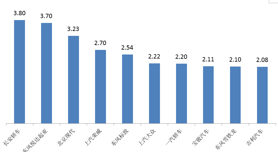 3月,10个品牌库存深度在两个月以上,分别是: 长安轿车、东风悦达起亚、北京现代、上汽荣威、东风标致、上汽大众、一汽轿车、宝骏汽车、东风雪铁龙、吉利汽车。