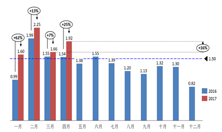 2017年5月18日,中国汽车流通协会对外发布2017年4月份“汽车经销商库存调查结果”。4月份汽车经销商综合库存系数为1.92,环比上升16%, 同比上升25%,经销商库存压力回升,库存水平位于警戒线以上。