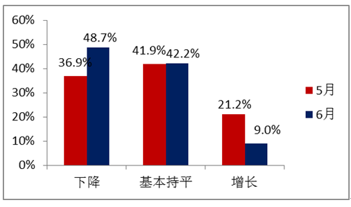 认为6月份集客量“下降”的经销商比例为48.7%;认为“增长”的比例为9.0%。