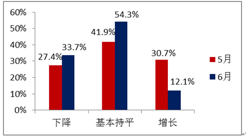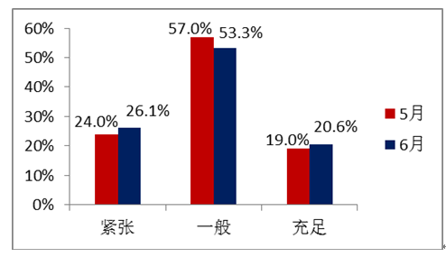 6月,认为流动资金“一般”的比例为53.3%;流动资金“充足”的比例为20.6%;认为流动资金“紧张”的比例为26.1%。