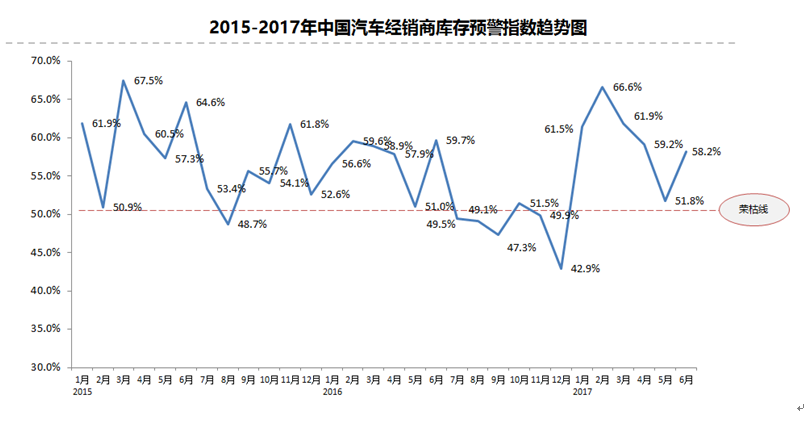 中国汽车流通协会发布的“中国汽车经销商库存预警指数调查”VIA(Vehicle Inventory Alert Index)显示,2017年6月库存预警指数为58.2%,比上月上升6.4个百分点,位于警戒线以上。