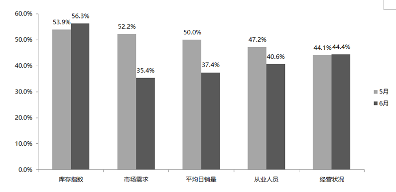 从分指数情况看:6月份库存分指数环比上升,市场需求分指数、平均日销量分指数、从业人员分指数环比下降,经营状况分指数与上月基本持平。