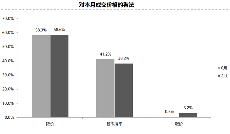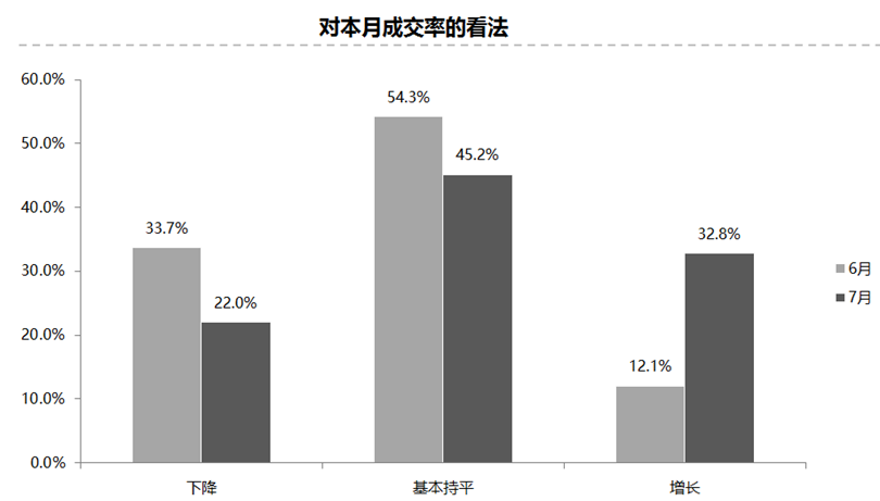 调查结果显示,认为7月成交率增长的比例为32.8%;认为下降的比例为22.0%;认为基本持平的比例为45.2%。