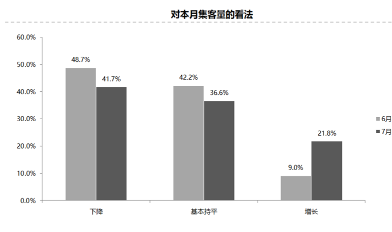调查结果显示,7月份集客量下降,认为7月份集客量下降的经销商比例为41.7%;认为增长的比例为21.8%;认为集客量基本持平的比例为36.6%。
