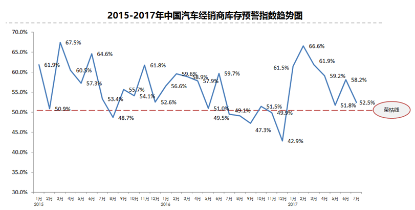 中国汽车流通协会发布的“中国汽车经销商库存预警指数调查”VIA(Vehicle Inventory Alert Index)显示,2017年7月库存预警指数为52.5%,比上月下降5.7个百分点,位于警戒线以上。
