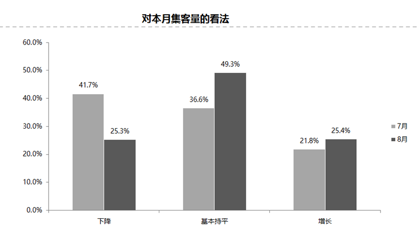 调查结果显示,8月份集客量与上月基本持平,认为8月份集客量下降的经销商比例为25.3%;认为增长的比例为25.4%;认为集客量基本持平的比例为49.3%。