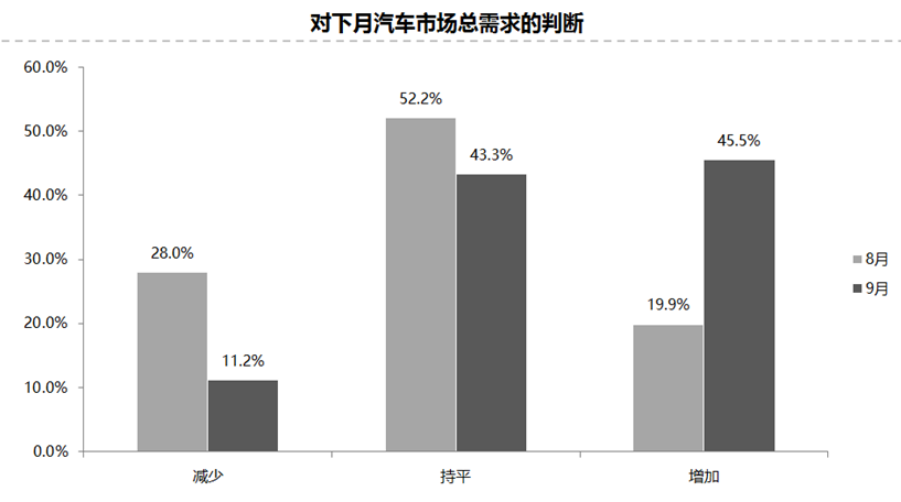 预计9月份市场需求比8月增加,认为市场需求“增加”的经销商比例为45.5%;认为市场需求“减少”的比例为11.2%;认为市场需求“持平”的比例为43.3%。
