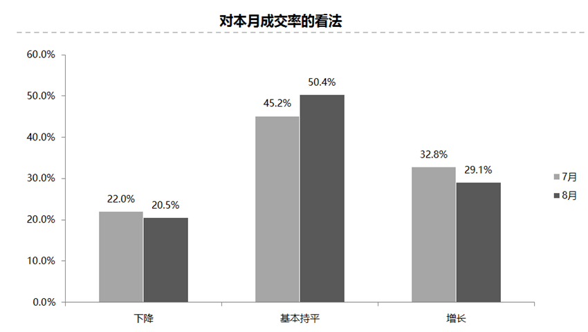调查结果显示,认为成交率增长的比例为29.1%;认为下降的比例为20.5%;认为基本持平的比例为50.4%。