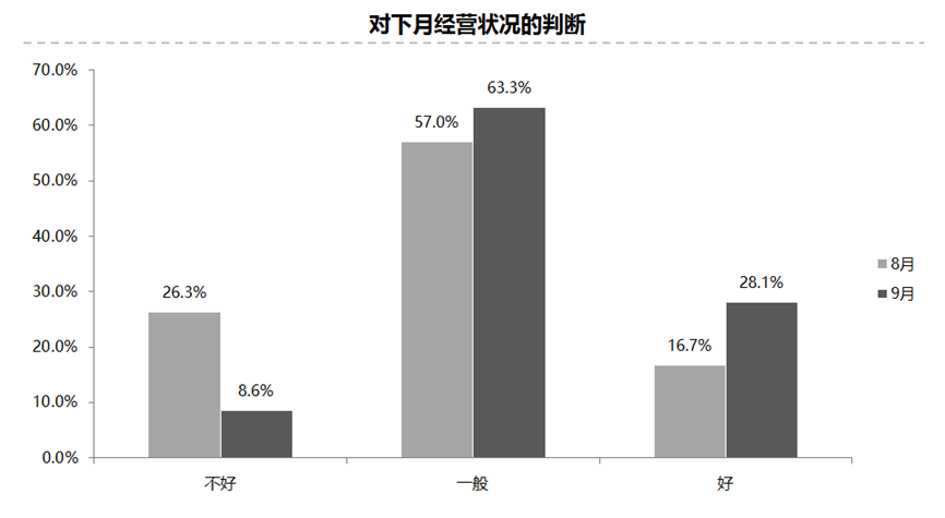 预计9月份经销商经营状况好转。调查显示,认为9月份经营状况“好”的比例为28.1%,认为“不好”的比例为8.6%;认为“一般”的比例为63.3%。
