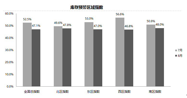 从区域指数情况看:8月份全国总指数为47.1%,北区指数为47.8%,东区指数为47.0%,西区指数为46.8%,南区指数为48.0%。8月份,各区域分指数均位于警戒线以下。
