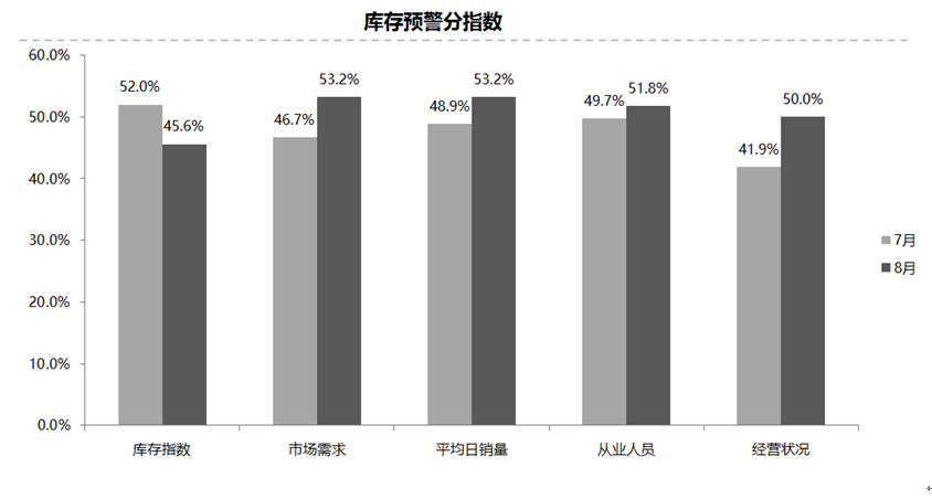 从分指数情况看:8月份库存分指数环比下降,市场需求分指数、平均日销量分指数、从业人员分指数、经营状况分指数环比上升。8月,库存指数为45.6%,市场需求指数为53.2%,平均日销量指数为53.2%,从业人员指数为51.8%,经营状况指数为50.0%。