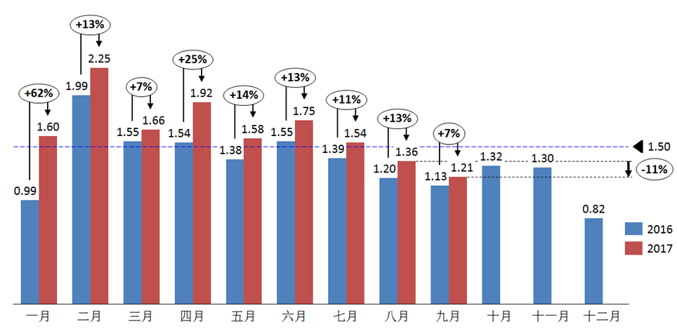 2017年9月汽车经销商库存系数为1.21