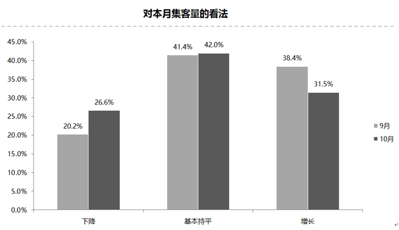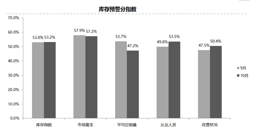 从分指数情况看:10月份库存分指数和市场需求指数与上月基本持平;从业人员分指数、经营状况分指数环比上升;销量分指数环比下降。其中销量分指数环比下降较多,降至荣枯线以下。