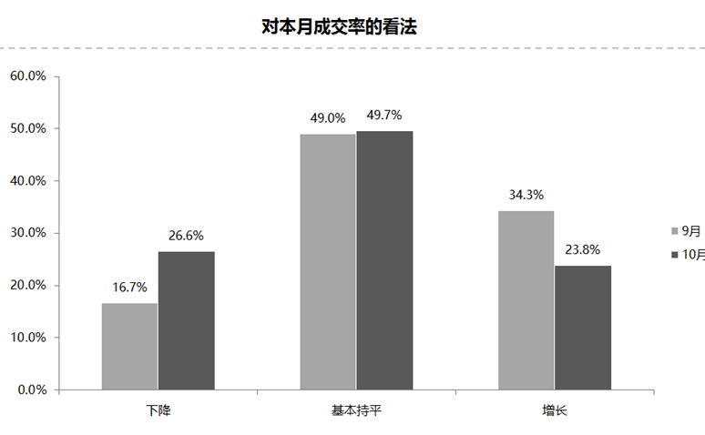 调查结果显示,认为成交率增长的比例为23.8%;认为下降的比例为26.6%;认为基本持平的比例为49.7%。