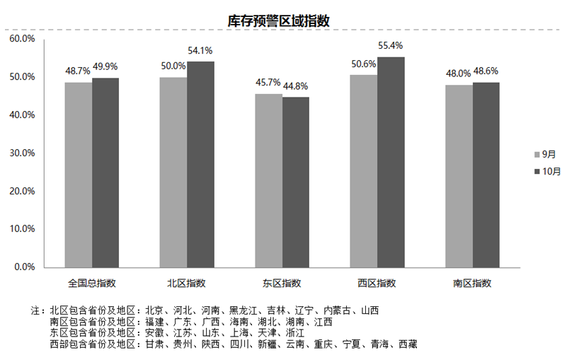 从区域指数情况看:调查显示,10月份全国总指数为49.9%,北区指数为54.1%,西区指数为55.4%,南区指数为48.6%,东区指数为44.8%。10月份,由于十九大和北方地区农忙影响导致北区库存预警指数升高;由于9月成都车展透支了西部区域10月的销量,导致西区库存预警指数升高。