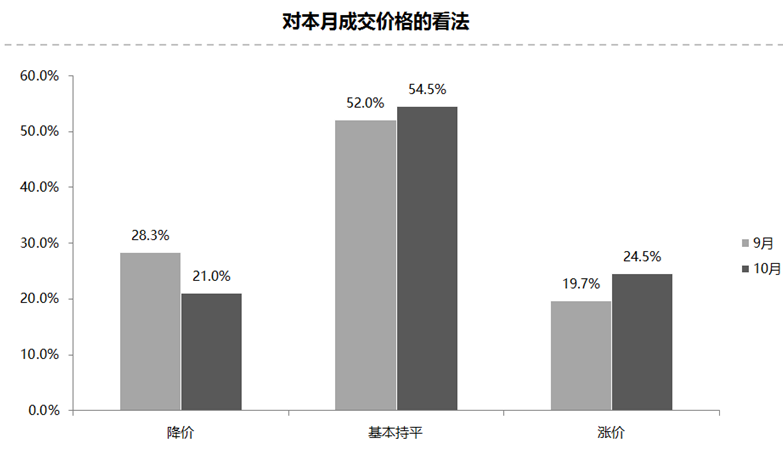调查结果显示,认为成交价格下降的经销商比例为21.0%;认为涨价的比例为24.5%;认为成交价格与上月基本持平的比例为54.5%。