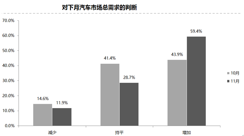 预计11月份市场需求比10月增加,认为市场需求“增加”的经销商比例为59.4%;认为市场需求“减少”的比例为11.9%;认为市场需求“持平”的比例为28.7%。