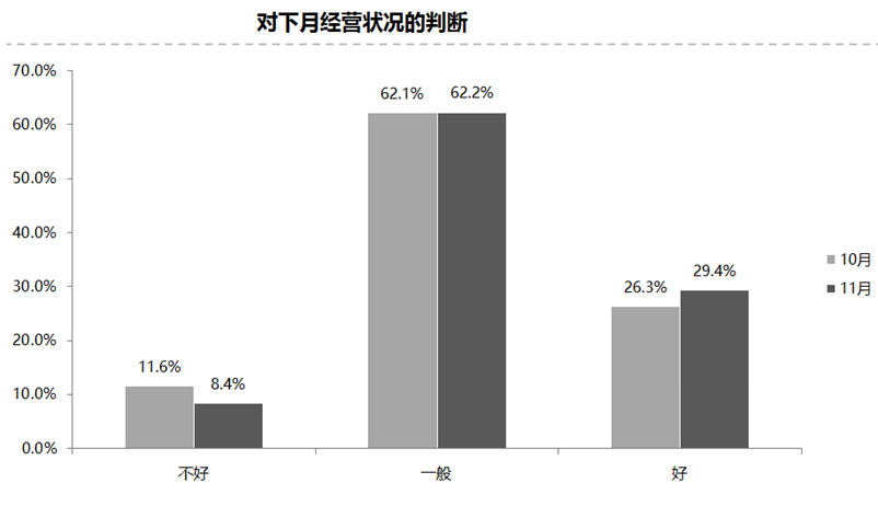 预计11月份经销商经营状况好转。调查显示,认为11月份经营状况“好”的比例为29.4%,认为“不好”的比例为8.4%;认为“一般”的比例为62.2%。