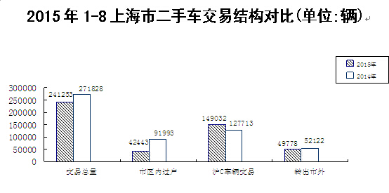 今年1-8月,全市累计二手车交易量为241253辆,同比下降11.25%。从交易流向看,市区内过户交易量为42443辆,同比下降53.86%;沪C号牌二手车交易量为149032辆,同比增长16.69%(其中新增沪C号牌二手车交易量为73424辆,同比增长19.29%);转出市外交易量为49778辆,同比下降4.50%。