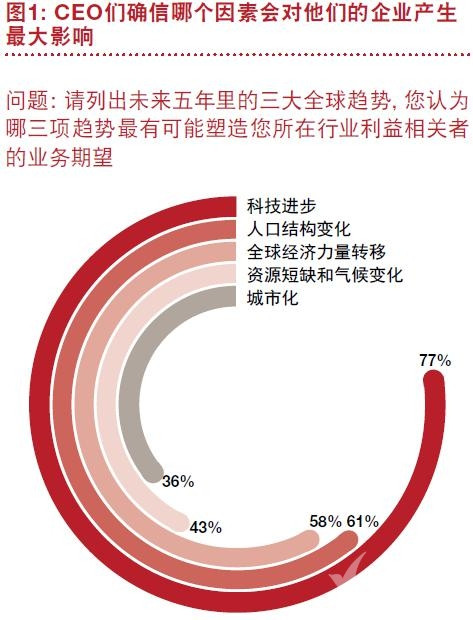 当被问及在未来五年里,什么因素最有可能塑造行业利益相关者的业务期望时,CEO们明确表态,指出“科技进步”是目前最有影响力的因素。这样的开头就引出一个新的问题, CEO们将如何应对“科技进步”冲击,将冲击化作力量,形成壁垒?
