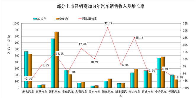 图2 部分上市经销商2014年总收入及增长率