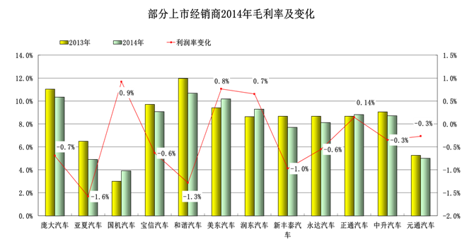 图10 部分上市经销商2014年汽车销售毛利率及变化