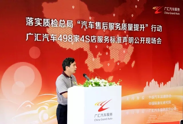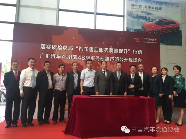 2016年5月27日,由中国汽车流通协会、中国标准化研究院主办,广汇汽车服务股份公司承办的“落实质检总局‘汽车售后服务质量提升’行动 广汇汽车498家4S店服务标准声明公开现场会”在北京寰宇恒通一汽大众奥迪4S店举行。国家质检总局质量司姚业强,中国汽车流通协会会长沈进军、副会长刁建申,中国标准化研究院服务标准化研究所程永红,广汇汽车董事长李建平、总裁王新明参加会议?;嵘?,广汇汽车携旗下498家4S店进行了企业服务标准自我声明公开,共同向消费者郑重承诺“机电维修一次修复、单方事故无人伤代办理赔服务、免费检测”三项内容。
