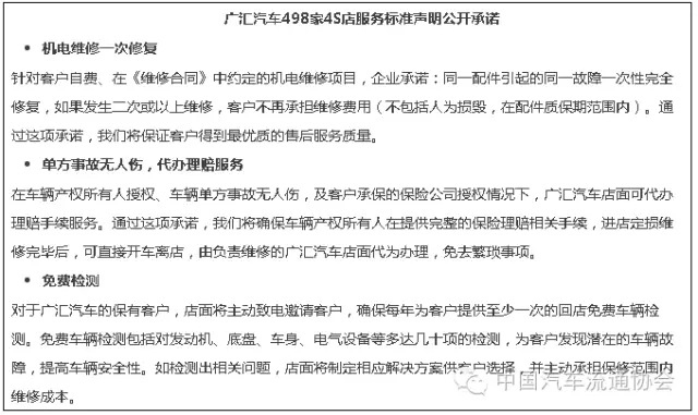 自2014年开始,在国家质检总局的部署下,中国汽车流通协会和中国标准化研究院在全国开展了“汽车售后服务质量提升”行动。作为汽车经销商集团百强榜首,广汇汽车积极响应政府和协会号召,以客户利益为出发点,通过企业服务标准的自我声明公开,倡导行业诚信经营,践行自身责任和使命。
