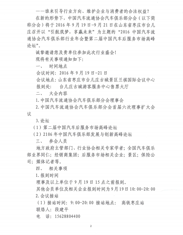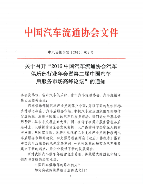 关于召开“2016中国汽车流通协会汽车俱乐部行业年会 暨第二届中国汽车后服务市场高峰论坛”的通知