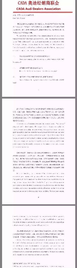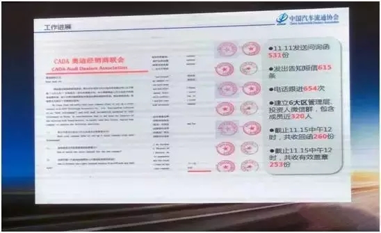 11月15日下午,奥迪经销商联会筹委会秘书长宋涛先生,亲手将这份问询函及收到的经销商盖章文件交给奥迪销售事业部德方总经理任思明先生,让其转交给相关人员,并明确表示,要组织谈判小组,约谈奥迪德国高层,要求德方十日内给与答复。任思明当场就表示接受这个挑战,邀请奥迪德国董事尽快与奥迪经销商见面,谈奥迪与上汽的合资事宜。