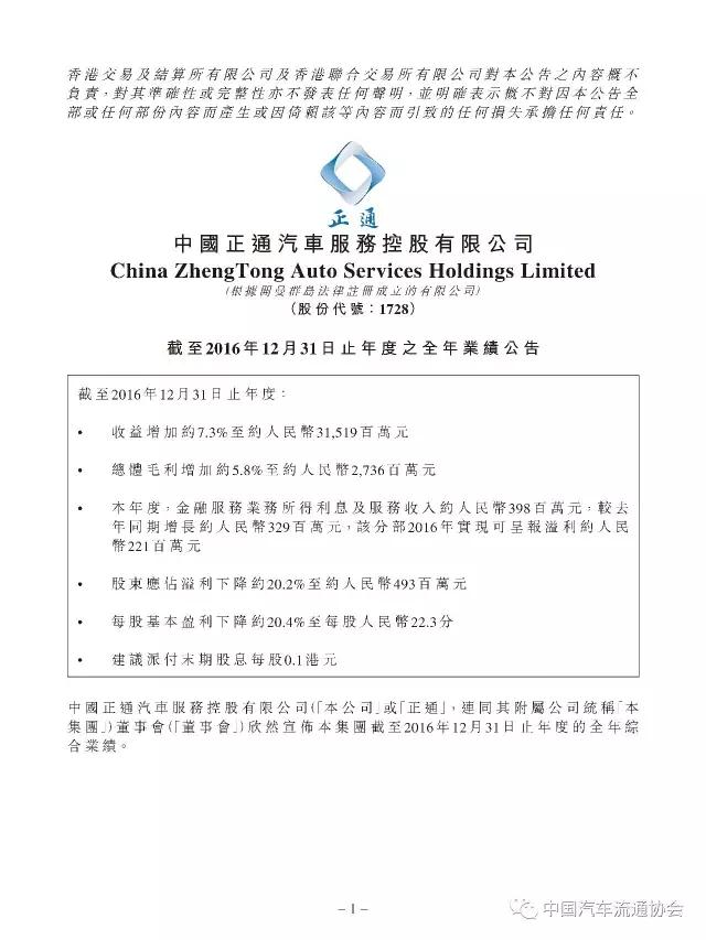 百强汽车经销商集团“正通汽车”2016年度经营业绩公布
