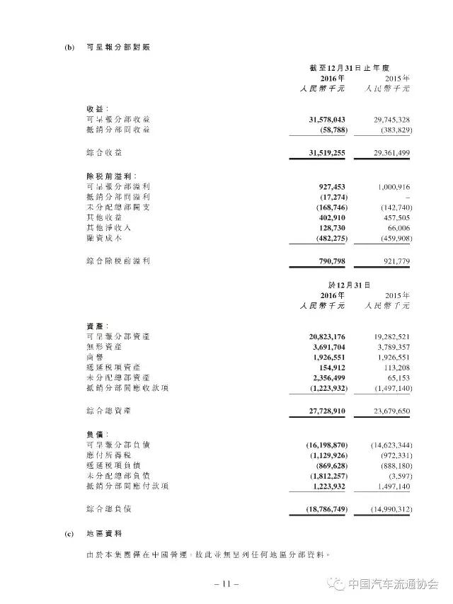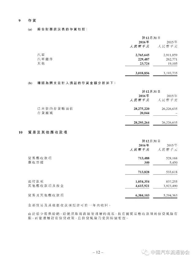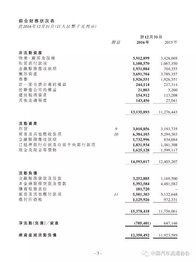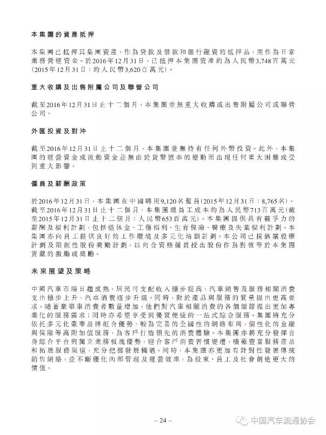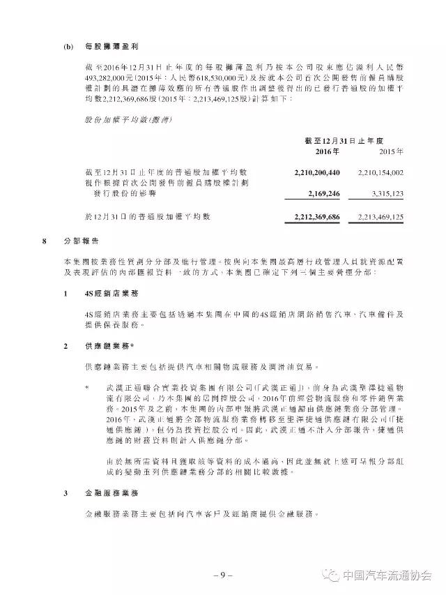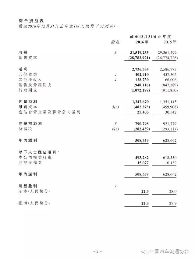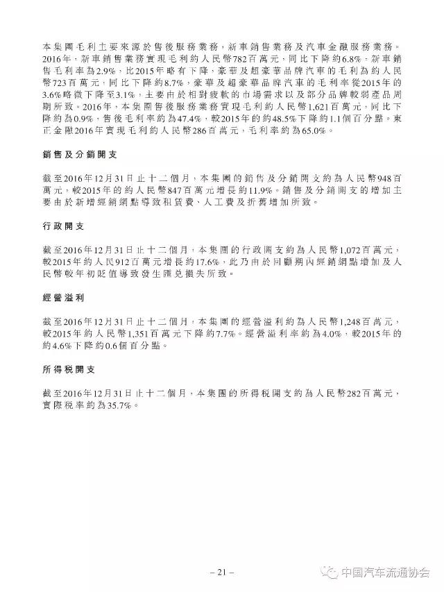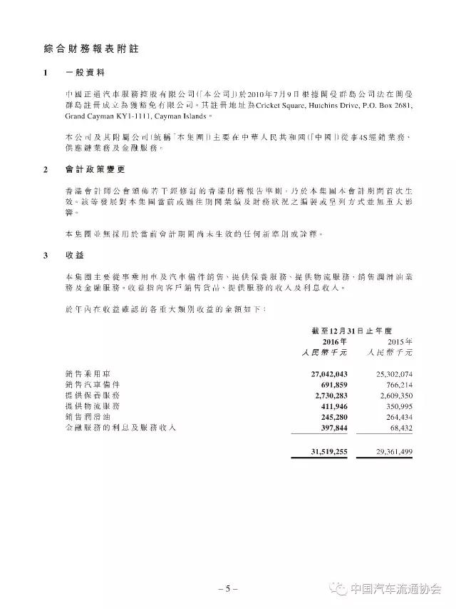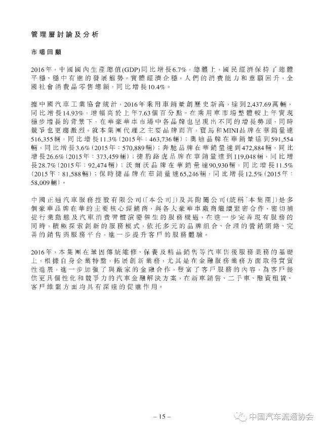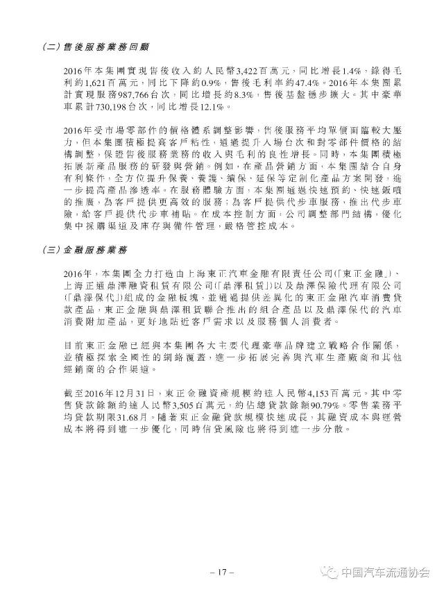 2016年度正通汽车实现新车销量96883台,同比增长9.5%;总收入315.2亿元人民币(货币单位下同),较上年同比增长7.3%;整体毛利27.4亿元,同比增长5.8%;金融服务业务所得利息及服务收入4亿元,实现利润2.2亿元;集团年内实现净利润5.1亿元,同比下降19.1%。