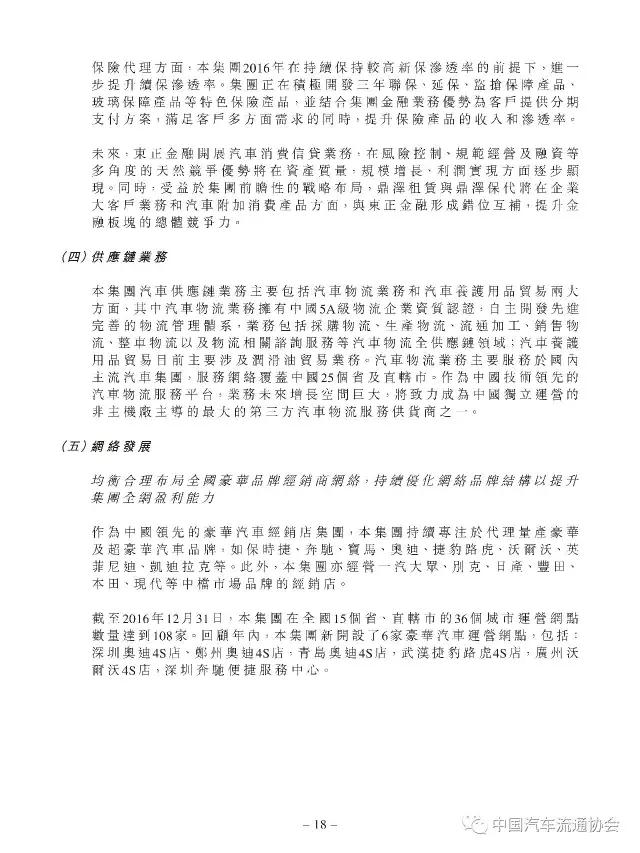 正通汽车在继续致力于豪华及超豪华品牌汽车销售业务与售后业务的基础上,2016年大力拓展汽车金融、保险代理、融资租赁、二手车等高附加值的后市场业务。