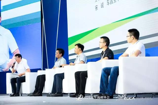 卓杰行CEO 邹强主持《车商如何突破发展瓶颈》互动沙龙,四位嘉宾为万高(上海)汽车服务有限公司副总裁安永强、台州博豪创始人陶小波、公平价合伙人兼总经理王子贵、车置宝华中区总经理宋诚。