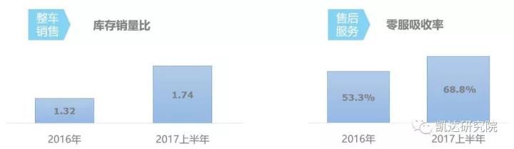 从风险控制能力来分析,2017上半年的库存深度为1.74,较2016年上升31.8%,已经超过1.5的库存警戒线,显示上半年有一定的库存压力;在零服吸收率上的表现要优于2016年,2017上半年为68.8%,较2016年提升了15个百分点,在整车市场竞争愈演愈烈的背景下,各品牌经销商对售后业务的运营能力逐步提升。