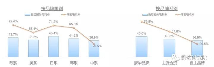 在售后服务??橹?,日系和欧系表现较好,售后毛利率分别为46.4%和43.7%,零服吸收率均在70%以上;中系表现最差,售后毛利率为36.9%,零服吸收率更是低于30%,可见中系品牌目前仍然是以整车销售为主。从品牌级别来看,豪华品牌的售后盈利能力最强,零服吸收率接近80%,合资品牌表现一般(近60%),自主品牌则表现最差。