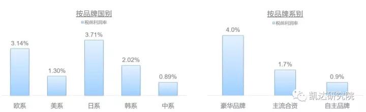 为了更加直观的展现各品牌在2017上半年的整体运营表现,凯达研究院以税前利润率为指标,按品牌级别分别进行排名(榜单阶梯的高度体现各品牌税前利润率的对标差距):