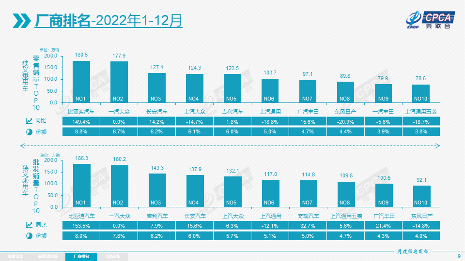 12月自主品牌零售106万辆,同比增长13%,环比增长20%。12月自主品牌国内零售份额为48.9%,同比增长3.8个百分点;1-12月累计份额47%,相对于2021年同期增长6.1个百分点。12月自主品牌批发市场份额57.5%,较去年同期份额增加10个百分点;1-12月自主品牌累计份额50%,相对于2021年同期增加6个百分点。自主品牌在新能源市场和出口市场获得明显增量,头部传统车企转型升级表现优异,比亚迪汽车、吉利汽车、长安汽车、奇瑞汽车等传统车企品牌份额提升明显。