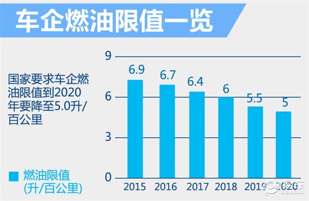 从长远规划来看,按照国家相关规定,到2020年车企燃油限值要降至5.0升/百公里??悸堑狡笠到岛娜挝窠现兀虼苏庑┎棵盼笠瞪瓒嗣磕暧秃拇锉曛?,目标由松至紧,从2015年到2020年,工信部为当年生产乘用车设立的平均油耗目标分别为百公里6.9升、6.7升、6.4升、6升、5.5升和5升,其中2016年所要达到的6.7升/百公里对于改善燃油消耗起到重要作用。