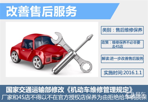 对于此前保修期内如果不在4S店保养,车辆一旦出了故障,4S店有理由拒绝车辆保修的问题,国家交通运输部对《机动车维修管理规定》进行了修改,明确规定了厂家和4S店不得以不在官方授权店保养为由拒绝给车辆质保。该项规定将于2016年1月1日开始实施。