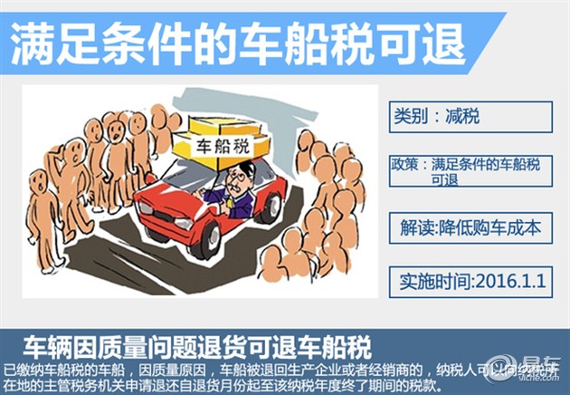 众所周知,在国内购买一辆新车需要缴纳的税,主要涉及进口关税(不包含国产车型)、增值税、购置税、消费税(这些都体现在售价中),以及用车过程中的车船税和除税收之外的保险费、检验费等各种费用。根据国家税务总局发布的《车船税管理规程(试行)》规定,已缴纳车船税的车船,因质量原因,车船被退回生产企业或者经销商的,纳税人可以向纳税所在地的主管税务机关,申请退还自退货月份起至该纳税年度终了期间的税款,退货月份以退货发票所载日期的当月为准。国税机关应当向地税机关提供车辆退货发票信息,以减轻纳税人办税负担。另外,已完税车辆被盗抢、报废、灭失而申请车船税退税的,由纳税人纳税所在地的主管税务机关按照有关规定办理。